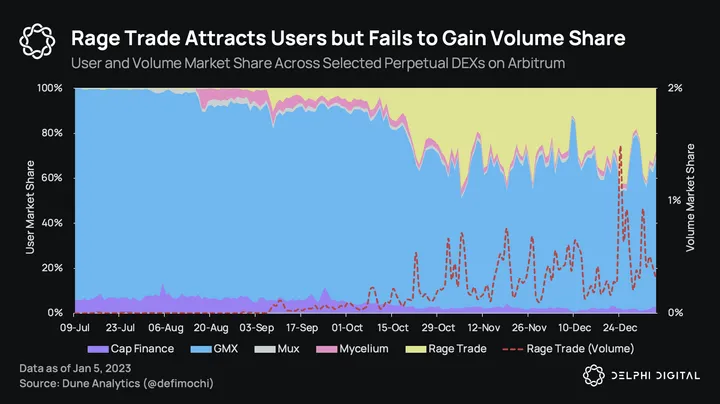 📊 Rage Trade Attracts Users but Fails to Gain Volume Share