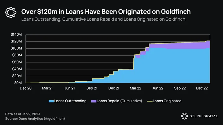 - From FinTech loans in Asia to smartphone financing in Africa, Goldfinch has originated over $120M in loans to date, of which about $100M are outstanding. However, loan growth has practically come to a standstill in the last few months.