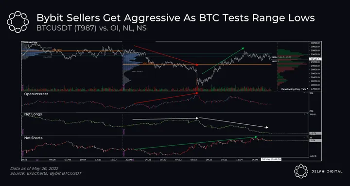 When looking at OI, NL, and NS from May 26th, we can see Bybit OI increasing steadily while BTC price rapidly declined from $30K to $28K. In addition to increasing OI, we can see a relatively flat trajectory of NL, meaning that not many new buyers were responsible for the increase in OI seen above. In fact, the tail end of this downside move was met with a large decrease in NL, indicating the forced closure/liquidation of long positions.