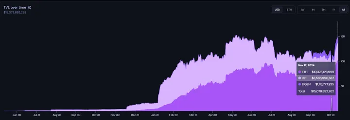 In the future, they plan to support permissionless tokens, allowing AVSs to accept any ERC-20 token as restaked assets, but currently they just accept ETH, ETH LSTs, and EIGEN to be restaked. As of November 13, 2024, they attracted +$15B TVL, composed of native staked ETH ($10 billion), ETH LSTs ($3.5 billion), and EIGEN ($1.1M)