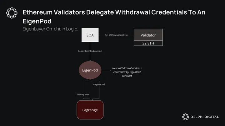 EigenLayer leverages this by allowing you to set a different contract (known as an Eigenpod) as your withdrawal address. When you eventually exit staking, your ETH is transferred to this Eigenpod, so essentially you’re delegating your withdrawal credentials to another contract.