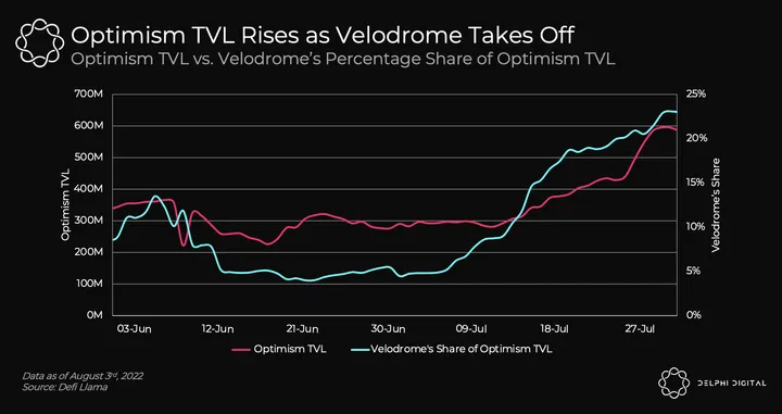 - On July 31, the total value locked (TVL) on Optimism touched an all-time high of $596 million, led by the rising popularity of Velodrome, a decentralized exchange protocol. The TVL on Velodrome currently makes up 23% of all TVL on Optimism.