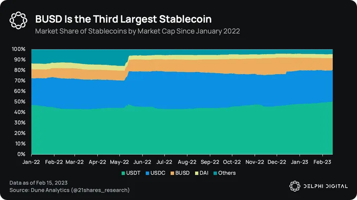 Paxos is a company regulated by the NYDFS. As the SEC announced plans to sue the company, the NYDFS directed it to stop issuing any new BUSD tokens. Currently, BUSD has a 9% market share but the circulating supply has decreased by 8% since the news. The circulating supply of USDP, another stablecoin also issued by Paxos, has also decreased by 11%. USDC supply is relatively unchanged, however, USDT supply is up 2%.