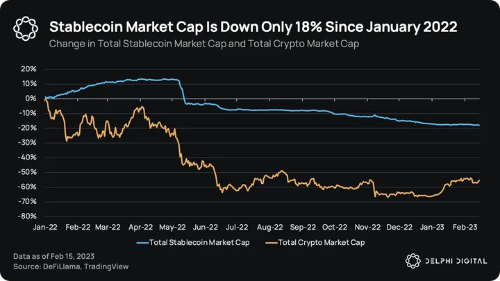 Stablecoins are one of crypto’s most impactful innovations. It’s one of the rare products made possible by this technology that has actual utility. In many parts of the world, stablecoins have been used to retain purchasing power, transfer funds in a permissionless manner, and access on-chain financial products among other use cases. Despite last year’s bear market, the total stablecoin market cap is down only -18% while the total crypto market cap is down -55%.