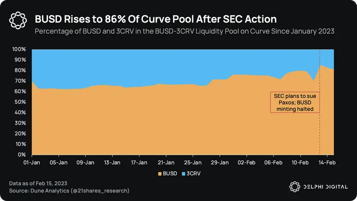 Liquidity for BUSD on Curve has been steadily inching down since the start of the year, indicated by the declining reserves of 3CRV in the BUSD-3CRV pool. The proportion of BUSD in the BUSD-3CRV pool spiked from 70% to 86% immediately following the SEC news. As traders sell BUSD for other stablecoins, the proportion of the pool in BUSD increases. Currently, the pool has 81% of reserves in BUSD.