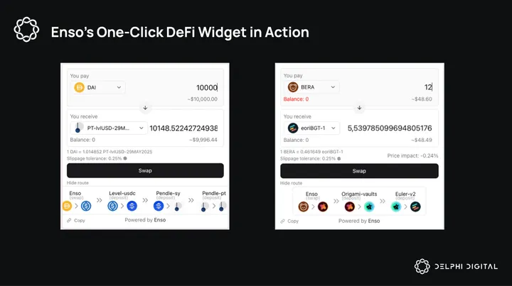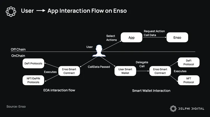 Enso’s flexibility is also visible through its support for both Externally Owned Accounts (EOAs) and Smart Contract wallets. Applications designed for EOAs can leverage Enso for all tokenized interactions, while applications enabling Smart Wallets can utilize Enso for both tokenized and non-tokenized interactions. This distinction matters because some DeFi protocols like Liquity don’t generate tokenized position representations.