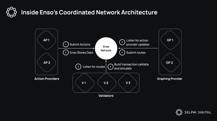 At this stage of the network, Enso operates a centralized service alongside the network to ensure stability and functionality. Validators still simulate bytecode solutions to verify their outcomes. Developers can provide actions and contribute through the centralized service, allowing shortcuts to exist with the much-needed stability during these early stages.