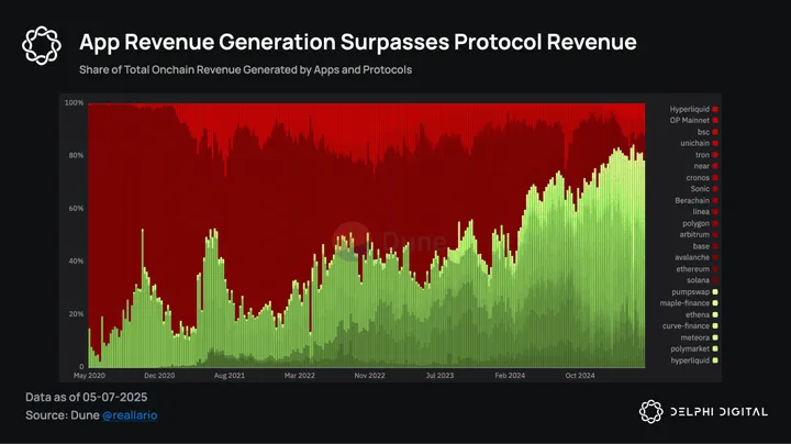 But a change has been occurring. For the past 14 months, app revenue has consistently surpassed protocol revenue and currently represents approximately 80% of total fees earned. The industry is gradually recognizing that crypto’s true winners will be successful applications that solve genuine problems and attract real users. Applications have sustainable revenue potential that outlasts the ephemeral valuation spikes of underutilized chains.