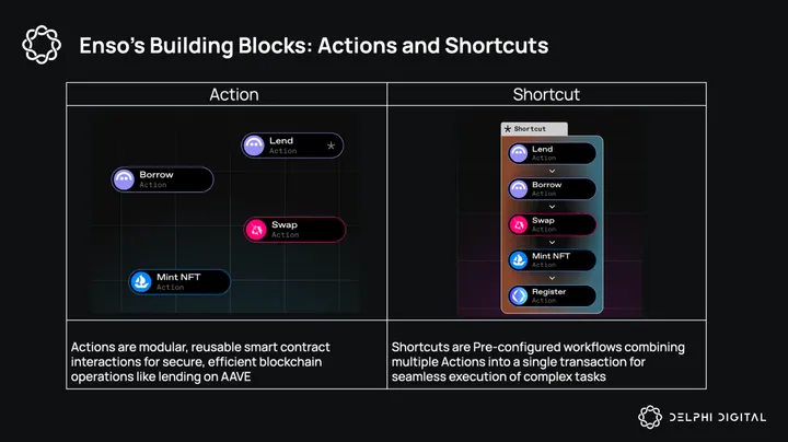 Before the execution of an intent, validators ensure the accuracy and security of this data, implementing checks to maintain data integrity, thus providing a simple framework for developers to interact with blockchains efficiently. Enso Network utilizes two fundamental building blocks in the creation and settlement of user intents: Actions and Shortcuts.
