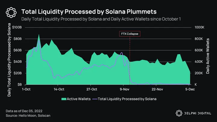- The daily total liquidity processed by Solana is down 96% in the wake of the FTX collapse. Solana averaged $32.9B per day of total liquidity processed from the beginning of October until the FTX collapse. Since then, Solana has averaged $1.4B per day.