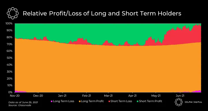 - The relative P&L of speculators and long-term investors paints a vivid picture of the last month. Short-term speculators have been capitulating on their spot holdings at a loss, with a number of speculators exiting for a profit. The last two months have been disastrous for speculators between the exodus of leveraged longs in May and strong spot capitulation in June.