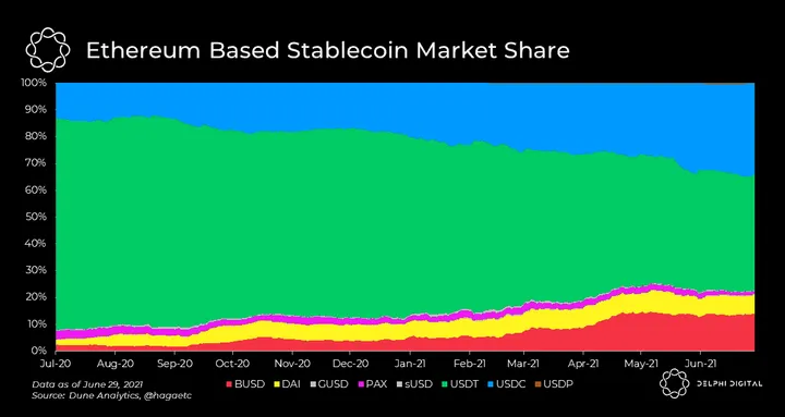 - USDT is the largest stablecoin by market cap, but USDC and BUSD have eaten into its market share as of late. Exactly one year ago, USDT accounted for 78% of all stablecoins on Ethereum while USDC made up just 13%. Since then, USDC’s market share has almost tripled to 35% while USDT’s reduced to 43%.