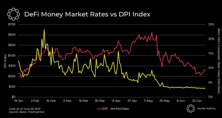 - DeFi yields are highly correlated to price as the majority of leverage is taken out to either increase a long position or to yield farm. Therefore, we can expect DeFi rates to continue moving alongside price.