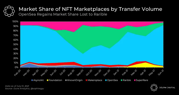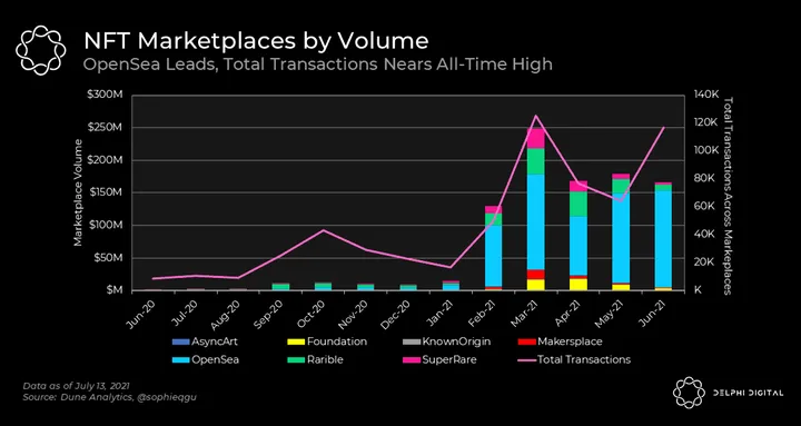 - There’s one thing NFT Marketplaces and decentralized exchanges have in common: a single platform owning the vast majority of the market. OpenSea is the Uniswap of NFT markets, and has seen resilient volume and usage in light of the broad market decline. The number of transactions, cumulatively, across these marketplaces hit an all-time high in Mar. 2021, but came close to breaking it in Jun. 2021 thanks to an uptick at OpenSea.
