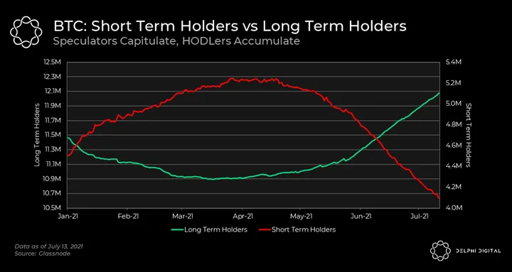 - While the trend in BTC holders is fairly obvious, there’s also a methodology quirk that comes into play. Long-term and short-term are subjective terms, and GlassNode defines a long-term holder as anyone that held BTC for more than 155 days. So after an address holds BTC for more than 155 days, they graduate from a short-term holder to a long-term holder.