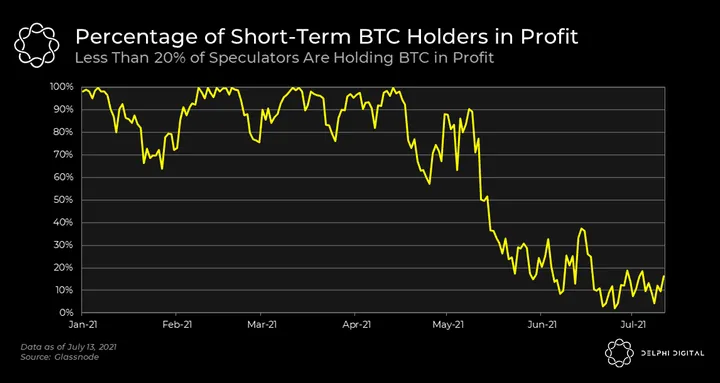 - As previously mentioned, the number of short-term holders declined by over 9% in 2021 thus far. The percentage of short-term holders in profit is calculated as the number of BTC held by these entities in profit divided by the total amount of BTC with short-term holders.
