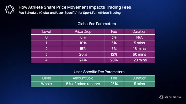 Every time an athlete is traded, a base fee of 3% is levied on the trade (down from an initial 5%), which scales to 20-25% depending on the size and timing of the trade. Higher fee parameters apply across the pool for a limited amount of time, but only come into play when a trade with a large price impact is executed. The surge fee exists to prevent large swings in share prices and to support liquidity when whales enter/exit.