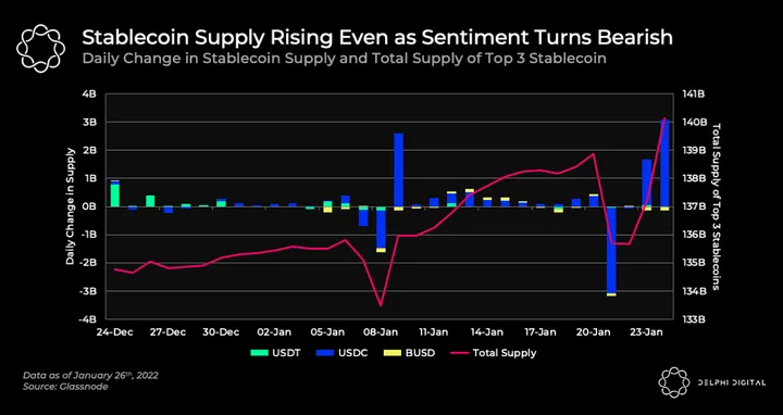 - Despite the current volatile environment, the stablecoin supply has grown by $5.3B over the past month. The ebbs and flows in stablecoin supply are primarily caused by USDC’s massive mints and burns.