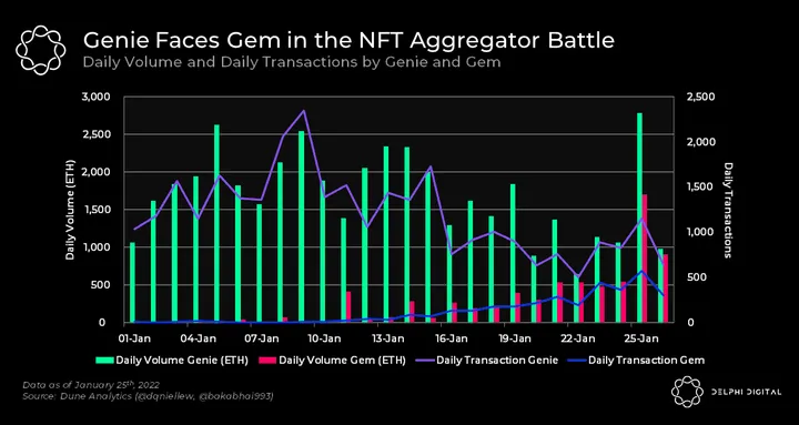- Being the first mover, Genie has already gotten a userbase and a rather consistent volume. However, since Gem’s launch, we can see that Gem is catching up to Genie in daily volume. Gem’s daily transaction is also slowly catching up to Genie’s, at around 50% of Genie’s daily transactions.