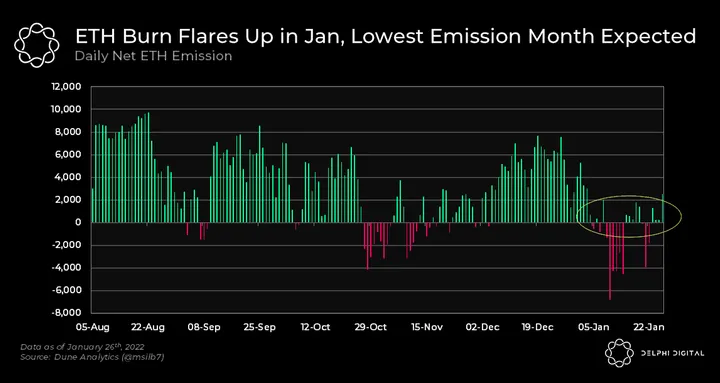 - OpenSea and NFTs played a large role in propping up transaction numbers and the volatility across crypto. In turn, this led to more token movements and swaps, further increasing this month’s burn. January 2022 is on its way to be the lowest ETH-emitting month since EIP-1559.