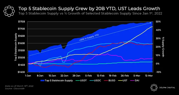 - The supply of the top 5 stablecoins has grown by $20B in 2022. USDC was responsible for the bulk of the growth, expanding $10B in supply, or half of the growth year-to-date.