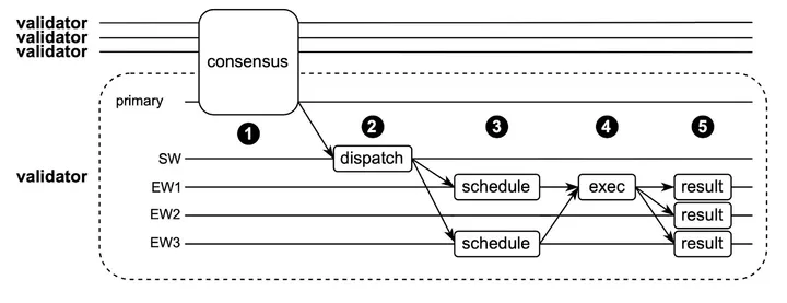 - SequencingWorkers (SWs): Multiple SWs can exist, each responsible for storing transactions and dispatching them for execution. They act as intermediaries between the consensus layer and the execution layer.