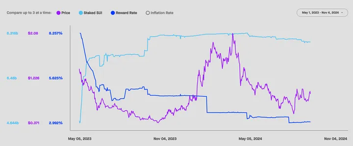 As per Staking Rewards, Sui has 108 validators, with 93 active validators having +30M SUI staked. Staked Sui has an annual reward rate of 2.8%, which is down from 4.5% a year ago in November 2023. For better context, staked Ethereum’s APY is 3.2%, and staked Solana’s APY is 6.48%. Unlike Ethereum and Solana, Sui does not subsidize staking rewards via inflation–Sui has a fixed token supply of 10B.