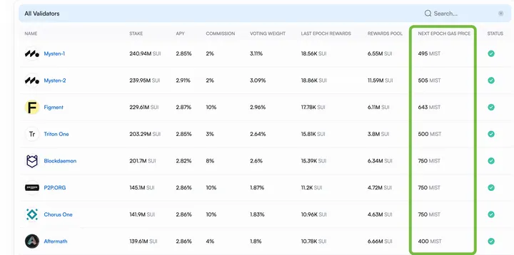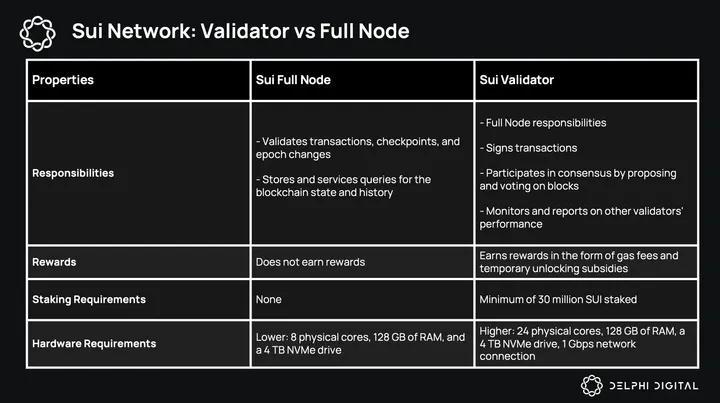 Validator: The role of validators includes everything a full node does, including signing transactions, participating in consensus, voting on blocks, and monitoring the performance of other validators (as with Reference Gas Pricing). Unlike full nodes, validators have higher hardware requirements and require a minimum stake of 30M SUI (in the process of lowering to 1M). DeFi teams on Sui, such as Cetus, Aftermath, Suilend, and Kriya DEX, also run their own Sui validators. While a stake of 30M SUI is the current requirement, with SIP-39, Sui will gradually reduce the required stake to 1M SUI. At this point, it will be easier to view pending bundles and capture MEV.