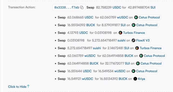 To atomically execute their strategies, searchers rely on PTBs (Programmable Transaction Blocks). PTBs can execute 1024 actions in a single execution operation. This also reduces the execution costs. Example PTB below.