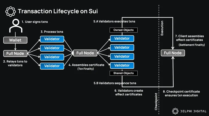 - A user creates a transaction and signs it with their private key. The signed transaction is picked by a Sui Full node running the Sui client.