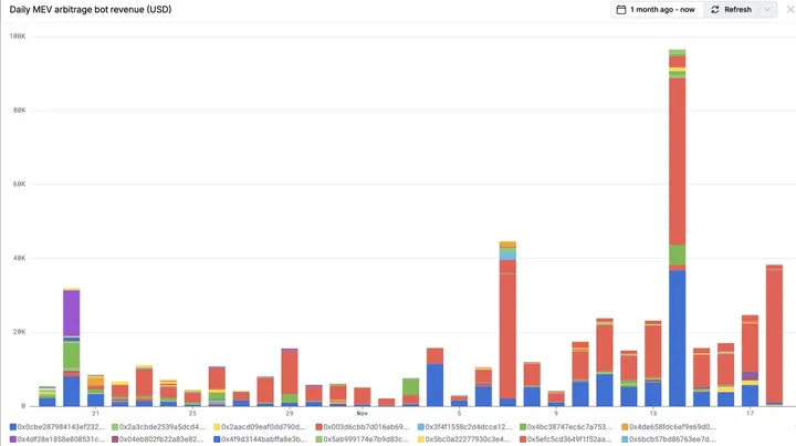 Data from Sentio shows an average of $18,000 in Arbitrage profits made by searchers over the past month. These figures do not include liquidations and sandwiches.