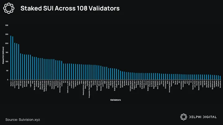 As mentioned, Sui has a total token supply of 10B SUI, with 2.8B SUI in circulation. Over 7.7B tokens or 77% % of all the tokens, are currently staked. The 7.7B SUI tokens are staked across 108 Validators.