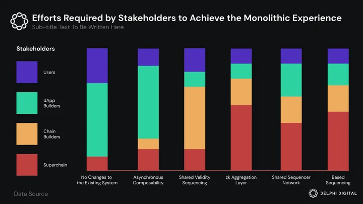 Each of the solutions we proposed require some effort from the Superchain developers, except the “No Changes to the Base Layer” solution. The next question would be the amount of effort required. Here is a simple diagram that depicts the amount of effort required by Superchain and by other stakeholders to achieve the monolithic experience.