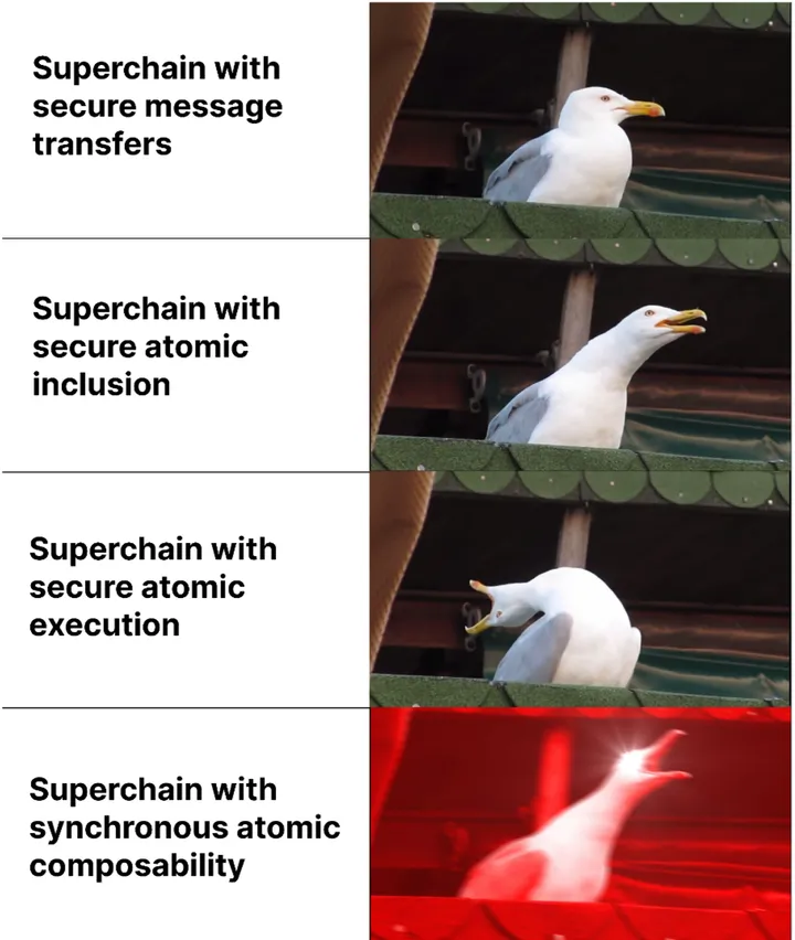 Superchain can choose to go the Cosmos/IBC route and offer trustless interoperability between the Superchain rollups. It is worth mentioning this is not an easy endeavor as it took 2 years and a lot of effort for the Avalanche ecosystem to build AWM (Avalanche Warp Messaging) and Teleporter, offering a system similar to Cosmos/IBC. The improvement in this option compared to the previous one is that it offers secure bridging of assets without MMA and third-party bridges. This will lead to cheaper bridging for users and a standard way to bridge assets between chains. Asynchronous composability combined with intents can offer a near-monolithic experience as well. One caveat is that interdependent rollups will likely lead to combined rollbacks if one of the chains is rolled back. Plus, cross-chain MEV will be a problem in this case similar to our previous option.