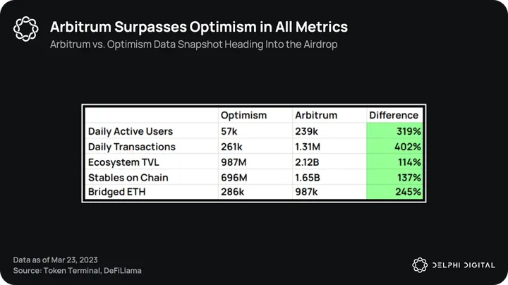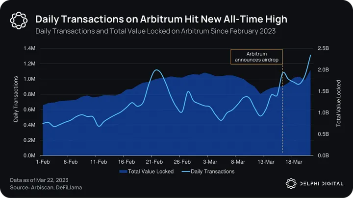 You can certainly argue that Arbitrumās usage will drop after the airdrop has been distributed. A lot of activity on the chain is from airdrop farmers looking to maximize their ARB allocation. However, you can also argue that the billions of liquidity injected into the Arbitrum ecosystem can spark a new wave of activity. While airdrop farmers tend to be value extractors, the general idea of earning monetary rewards for being an early adopter is one of the key tenets of crypto.