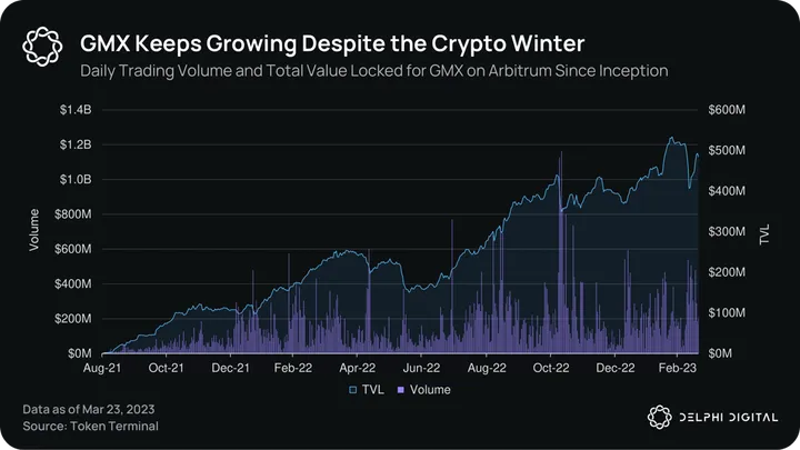 Enter GMX, the destination for most users bridging assets over to Arbitrum. A decentralized exchange for spot markets and perpetual futures, GMX has processed over $93B in volume since its inception on Arbitrum. While GMX currently constitutes 25% of the total value locked on Arbitrum, this is down from 45% in the second half of last year as other Arbitrum-based projects gain traction.