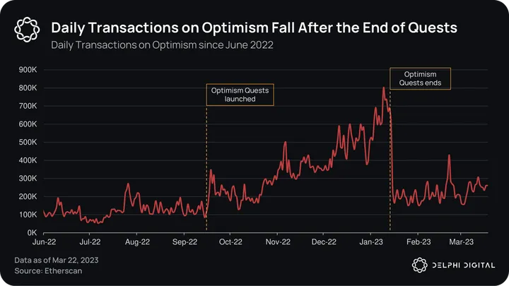 Optimism also held an airdrop of their governance token OP over nine months ago. The token was listed on the market at a price of $1.40 and has since moved up 82% in USD terms and over 103% in ETH terms. This comes despite the daily transactions on Optimism falling by 72% after the end of the Optimism Quests program on Jan. 17, 2023. Quests was an initiative by Optimism that gave out free NFTs to users who interacted with protocols on the network. However, daily transactions on Optimism increased by more than 4x between the launch and end of the program, demonstrating the power of airdrops to incentivize usage.