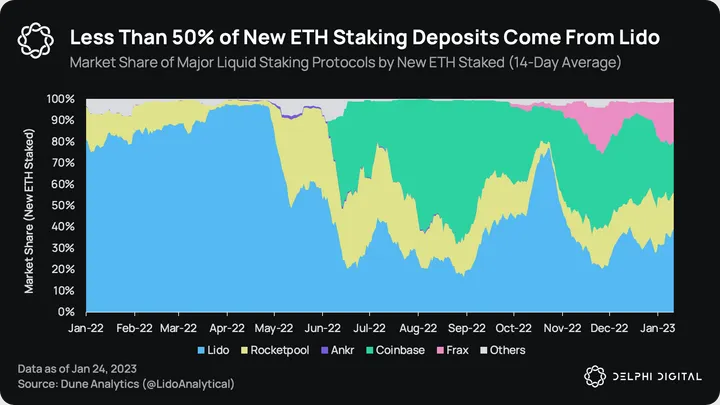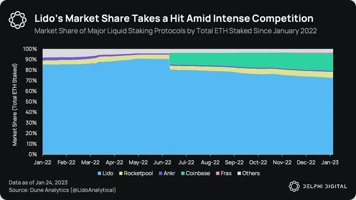 Currently, the dominant player in the war of liquid staking protocols is Lido. However, its market share has consistently declined since Coinbaseâs entry into the liquid staking market in June 2022. While Lidoâs market share stood at 85% in the beginning of 2022, it has since come down to 73%. And now, another entrant threatens to take even more market share from Lido⊠Frax Finance.