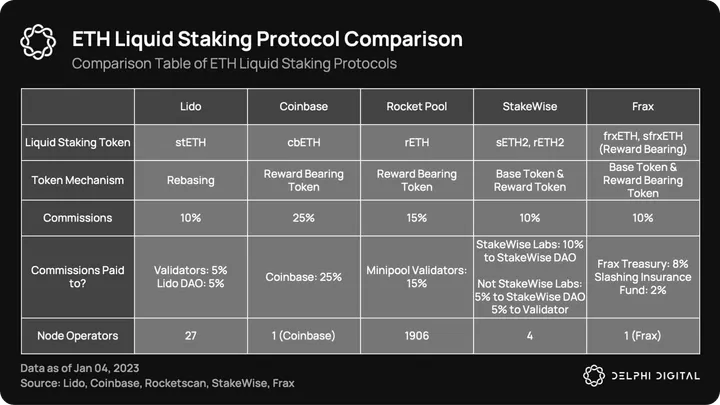 Some of the most notable protocols in this space include Lido, Coinbase, Rocket Pool, and Frax. Lidoâs stETH is a rebasing token where the number of tokens held increases to reflect accumulated staking yield. Coinbaseâs cbETH and Rocket Poolâs rETH is a reward-bearing token where the value of the tokens held increases to reflect accumulated staking yield. While Frax Financeâs sfrxETH is also a reward-bearing token, it is complemented by frxETH which is a stablecoin pegged to the value of ETH.