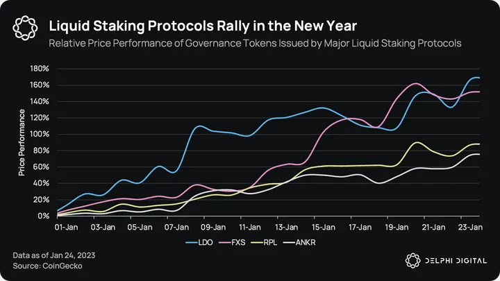 In March, Ethereumâs Shanghai upgrade will go into effect, which will also allow you to unstake the ETH (you canât do this currently). The narrative of liquid staking is out in full force as we inch closer to the Shanghai upgrade. Since the beginning of 2023, liquid staking protocols have outperformed, with the market leader LDO gaining 167% in the past 3 weeks.