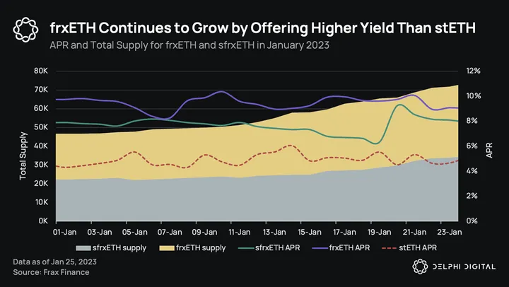 During the month of January, the total supply of frxETH has increased 58% while the total supply of sfrxETH has increased by 55%. Currently, there are 73.6K frxETH tokens but there are only 34.6K sfrxETH tokens. This allows sfrxETH holders to earn enhanced staking rewards sourced from ETH deposited by other users as well. These are users who have minted frxETH but havenât staked for sfrxETH.