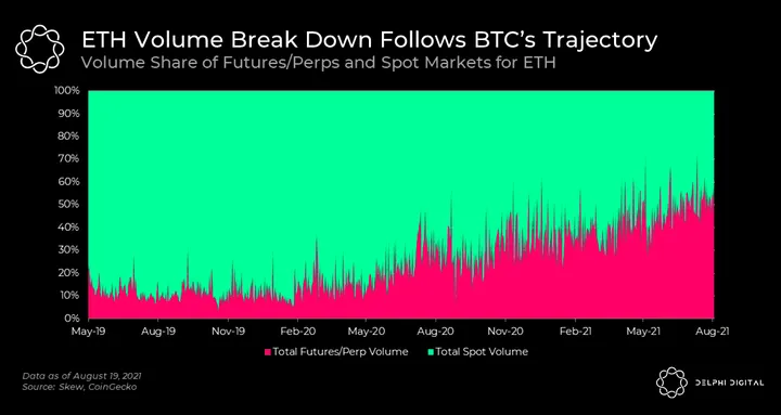 - Over time, as more ETH moves into Ethereum’s DeFi ecosystem, it seems reasonable to expect centralized exchange volumes to heavily skew in favor of futures and perps.