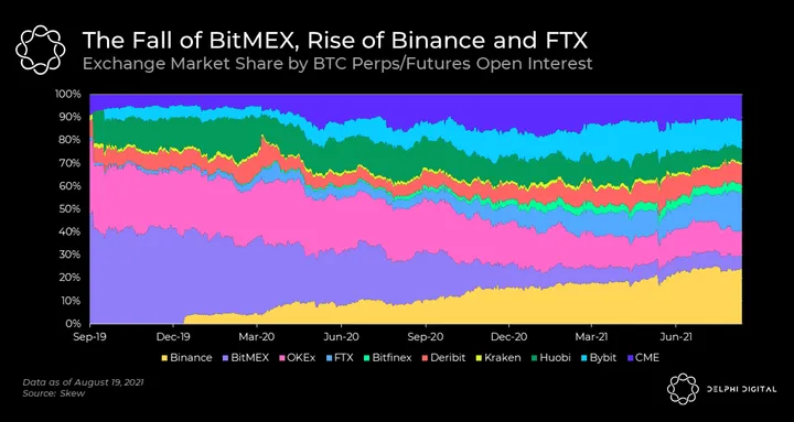 - OKEx and Huobi were thriving before China’s latest crypto crackdown, but there’s been a sizeable decline in their market share of futures/perps in recent months. FTX, Deribit, and Bybit have stepped up to capitalize on the opportunity. Growing market share for Western exchanges — including institutional ones like CME — could set the tone for the next few years.