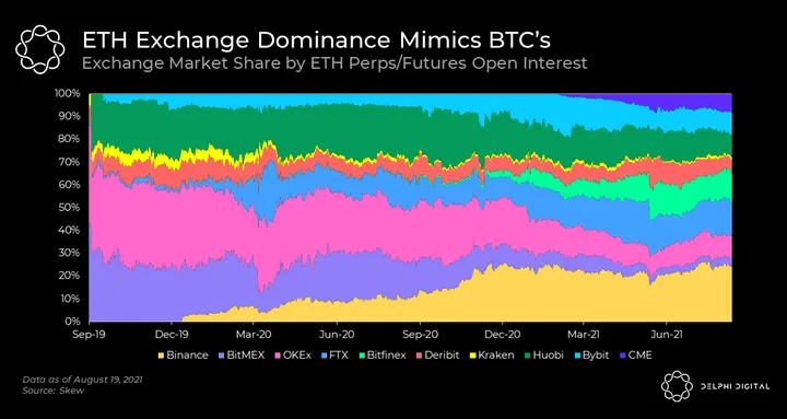 Similar to BTC, there’s a clear trend of Western exchanges rapidly gaining market share in ETH derivatives. However, there are a few notable exceptions. Bitfinex’s share of open interest has risen significantly since the second half of 2020, and Bybit hasn’t had the same success it’s had on BTC perps with ETH perps.