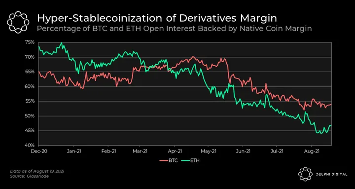 - The age of collateralizing derivatives positions with the native asset is coming to an end as traders rapidly shift from coin-margin to cash-margin (stablecoins).