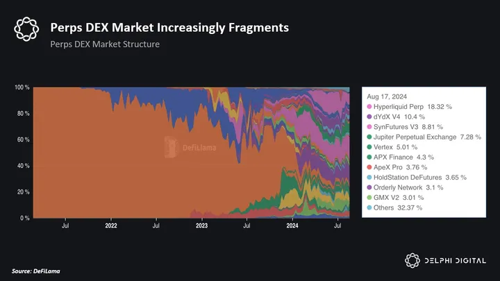 - Hyperliquid: The Hyperliquid team has done an incredible job building out one of the most intuitive perps trading experiences. Today Hyperliquid is the leading perps DEX by trading volume at 27% market share. Hyperliquid has also recently integrated their own spot DEX. I would not be surprised if in the near-future the team uses their current market positioning to ship adjacent products such as a lending arm and perhaps a prediction market.