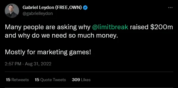 - Limit Break: this will be a key project to watch heading into 2023, as Gabe has already suggested that the majority of their $200M raised will be spent on marketing, some of which is destined for an upcoming Super Bowl intended to drive the largest free mint ever. It’s likely that Gabe’s experience running Machine Zone will help establish many best practices in web3 game design and live operations.