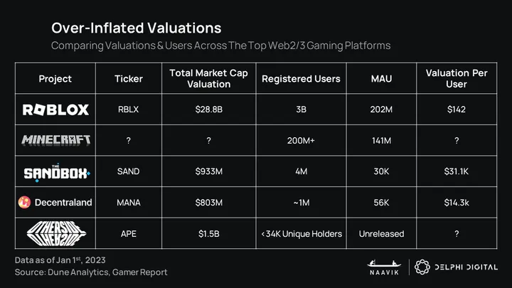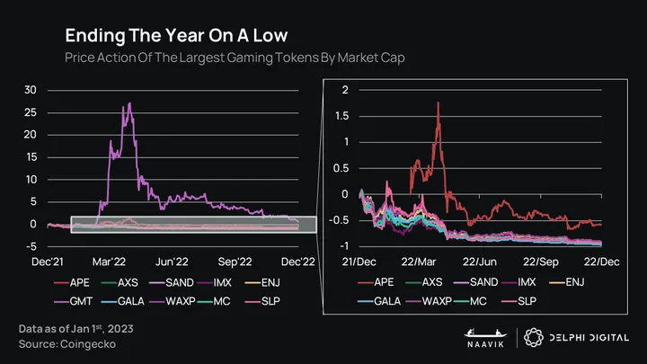 Since the start of the year, the top 10 web3 gaming tokens by market cap have fallen by an average of 97%. This is partly due to the overall decline in interest from retail investors; however, as we alluded to earlier, the primary factor is the inability of the first generation of web3 games to maintain sustainable in-game economies and active player bases.