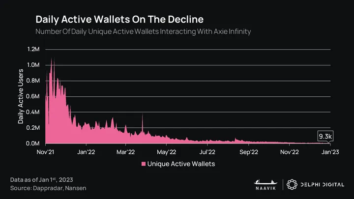 The combination of inflated asset prices, the beginnings of a market crash, rapid token inflation, rebalancing efforts that reduced in-game earnings, and an increasingly negative sentiment towards P2E gaming slowed the number of new users entering the game. Since the peaks seen in November 2021, asset prices have subsequently entered into a downward spiral and Axie Infinity’s daily active users (DAU) has been on the decline as earnings took a back seat as the leading retention incentive.