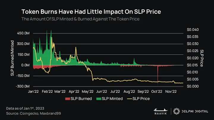 In a bid to re-engage its user base and attract real players, the game is in a state of transformation. Throughout 2022, the Sky Mavis team has implemented more than 20 updates for Axie Infinity/Origins. The vast majority of these were centered around gameplay balancing, but it was also nice to see a number of deflationary sinks introduced, along with increased token fees (for crafting Runes and Charms) and adjusted token rewards. Several updates include breeding fees tripling, an increase in marketplace fees, a rebalance of economic faucets, and new game modes such as Axie Origins (which leans into free-to-play). That said, we’re yet to see evidence in the data of this having the desired effect. Despite these efforts and the project burning more than 14B SLP tokens in the process, SLP prices are still down as much as 99% from their all-time highs. AXS, the governance token, and the Axie NFTs themselves are fairing similarly.